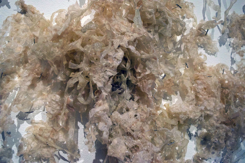 As Within as Without, mixed media and found objects (bandaids, amber jars, foundry wax, t-pins, welded steel, skinned sleeping bags), 2018.